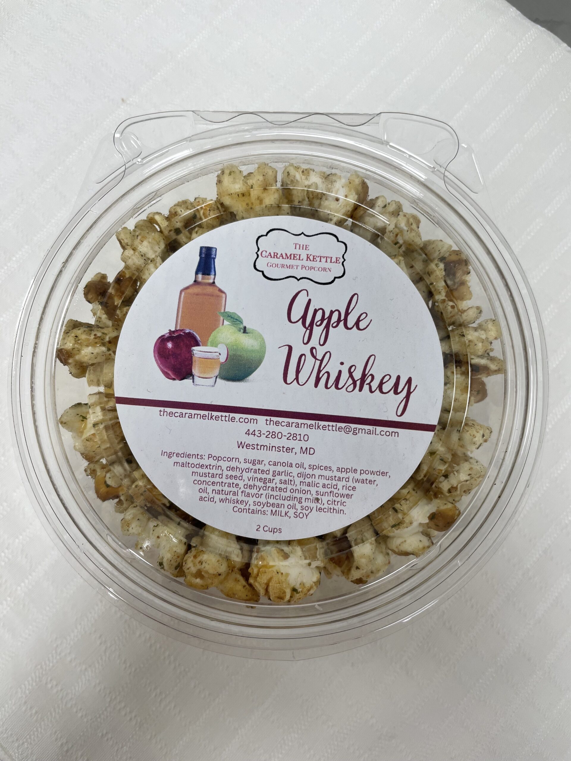 Our Apple Whiskey Popcorn was inspired by the rich flavor of bourbon whiskey combined with the sweet and tangy flavor of apples. Real bourbon whiskey and dried apples blended with sea salt, garlic, herbs, and a hint of seasonings. This is a unique blend of sweet and savory that you will love!